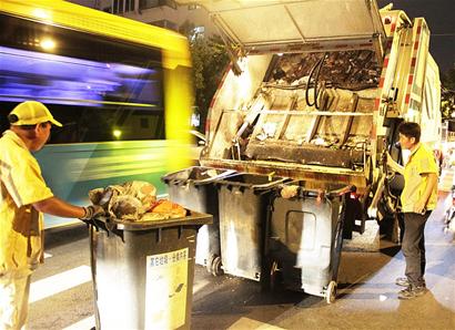 9月18日晚8時許,唐前和將裝有廚余垃圾的綠色垃圾桶和裝有其它垃圾的灰色垃圾桶分別推到馬路兩側,一輛垃圾收運車將灰色垃圾桶的垃圾運走,大約一個小時后,運輸廚余垃圾的車輛將路邊綠色垃圾桶的垃圾運走。隨后,唐前和再將空桶推回到各個居民樓下。?