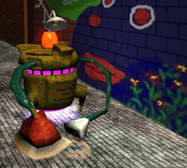 未來的垃圾桶十分奇怪,有八只機器爪子撐著地,可以疾走如風;四條機器手臂來回舞動,用于撿拾地上的垃圾;頭上的磁力線為它辨別方向,一個大嘴似的大孔用來吸收垃圾,圓柱的身體用來裝載垃圾。