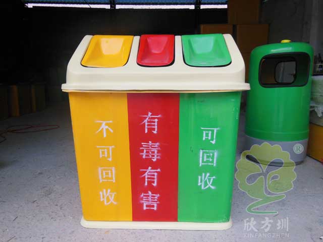 ?1、三分類綠色環保玻璃鋼垃圾桶強度高,防水耐高溫,不褪色,易清潔,無盜用價值。