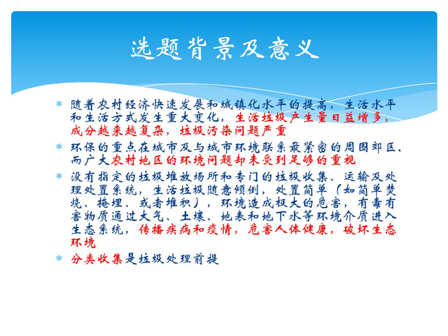 隨著農(nóng)村經(jīng)濟(jì)發(fā)展和城鎮(zhèn)化水平的提高,生活水平和生活方式發(fā)生重大變化,生活垃圾產(chǎn)生 量日益增多,成分越來越復(fù)雜,垃圾污染問題嚴(yán)重。環(huán)保的重點(diǎn)在城市與城市環(huán)境聯(lián)系最緊密的周圍郊區(qū),而廣大農(nóng)村地區(qū)的環(huán)境問題卻未收到足夠的重視;沒有指定的垃圾堆放場(chǎng)所和專門的垃圾收集、運(yùn)輸及處理處置系統(tǒng),生活垃圾隨意傾倒,處置簡(jiǎn)單(如簡(jiǎn)單焚燒、掩埋、或者堆積),環(huán)境造成極大的危害,有毒有害物質(zhì)通過大氣、土壤、地表和地下水等環(huán)境介質(zhì)進(jìn)入生態(tài)系統(tǒng),傳播疾病和疫情,危害人體健康,破環(huán)生態(tài)環(huán)境,以下農(nóng)村生活垃圾分類ppt由分類垃圾桶網(wǎng)收集整理。