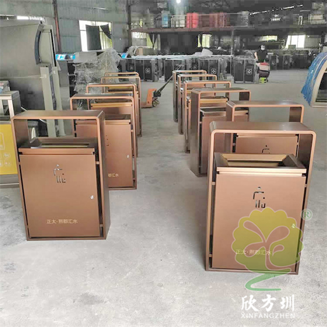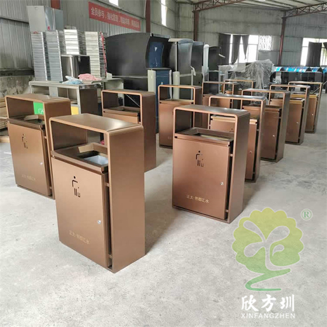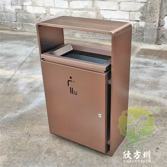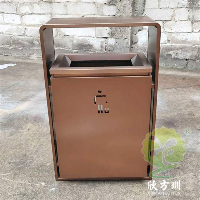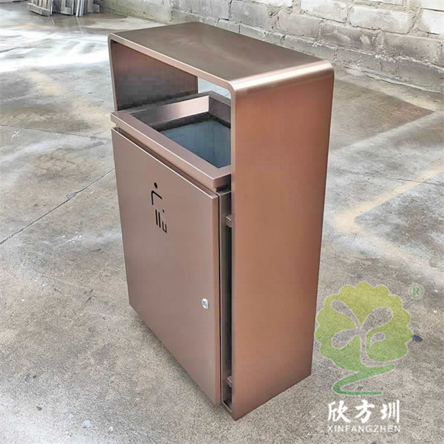 室內新樓盤電梯口方形不銹鋼果皮箱采用201不銹鋼板制作而成,室內單桶方形設計,果皮箱表面電鍍噴塑上色,正反面人頭標可以采用鏤空或者腐刻絲印,桶身正反面下方絲網印刷企業logo,三角鑰匙開門可以取出內置內筒,頂部無煙灰盅需要煙灰盅可以定制。