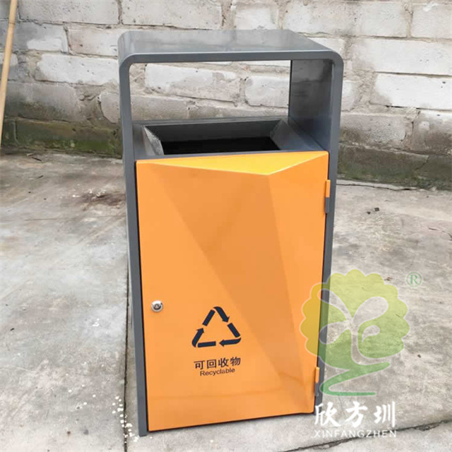 戶外學校三色菱形不銹鋼分類垃圾桶可以選用不銹鋼板、冷軋鋼板、鍍鋅鐵板制作,方形單桶組合式設計,框架表面噴塑烤漆灰色,橘黃色和綠色門板菱形設計,淺灰色平面門板,門板可以絲印分類標識及企業logo,可以使用三角鑰匙開門取出內筒。
