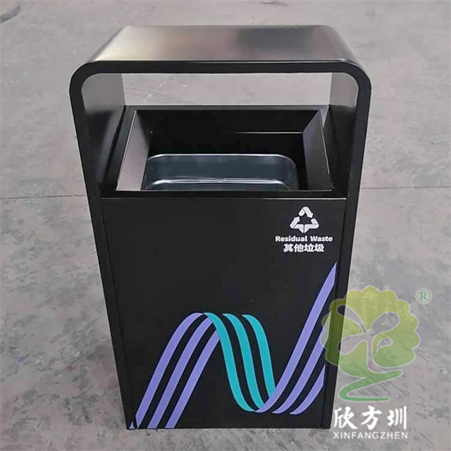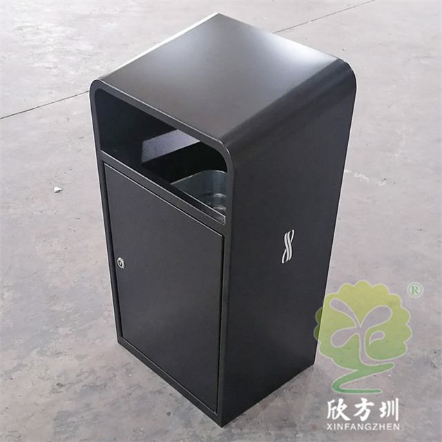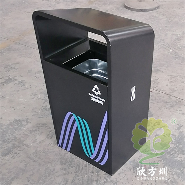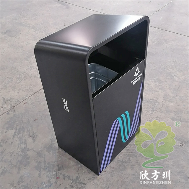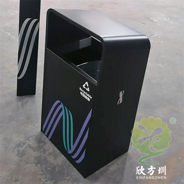 戶外廣場加厚不銹鋼垃圾桶果皮箱這款外筒201不銹鋼 1.5mm 厚度生產,桶身整體黑色噴塑烤漆,絲印企業logo和分類標識,UV打印彩色圖案,方形單筒頂部坡面前高后低設計,背面可以使用三角鑰匙取出內置的內筒,可以根據客戶要求定做。