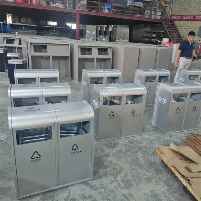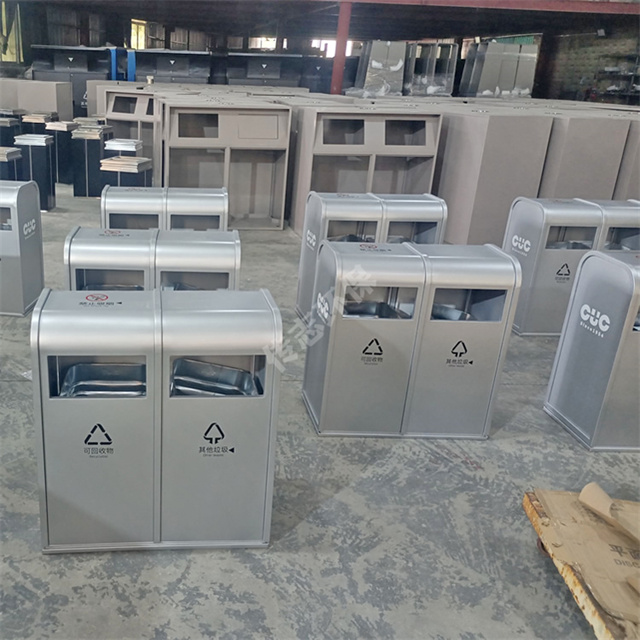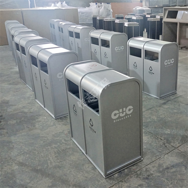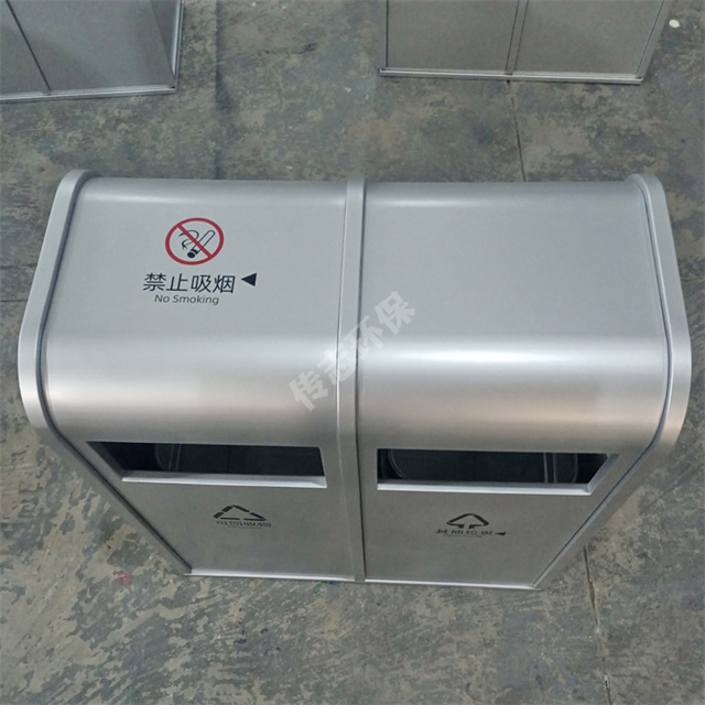 戶外銀色方形雙分類不銹鋼垃圾桶采用1.2mm厚201不銹鋼板制作而成,戶外兩連體雙分類方形設(shè)計(jì),桶身金屬表面噴粉銀色,油墨絲網(wǎng)印刷最新國(guó)標(biāo)分類標(biāo)識(shí)及企業(yè)logo,可以定制材質(zhì)厚度以及銀色或者規(guī)格,果皮箱無煙灰盅。