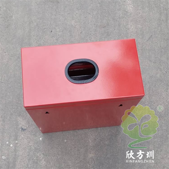 掛壁式噴粉烤漆方形不銹鋼有害垃圾箱采用0.8mm厚201不銹鋼板制造,也可以采用鍍鋅鐵板制作,方形掛壁式橢圓形直投口設計,金屬表面噴粉烤漆紅色上色,正面采用三角鑰匙可以取出內置的鍍鋅板內筒,投口帶膠墊防止投放時刮傷手掌。