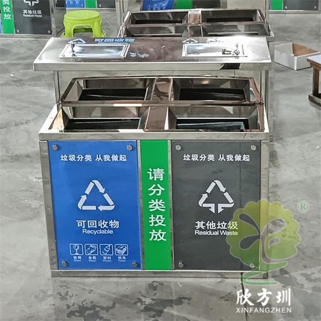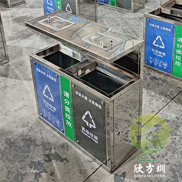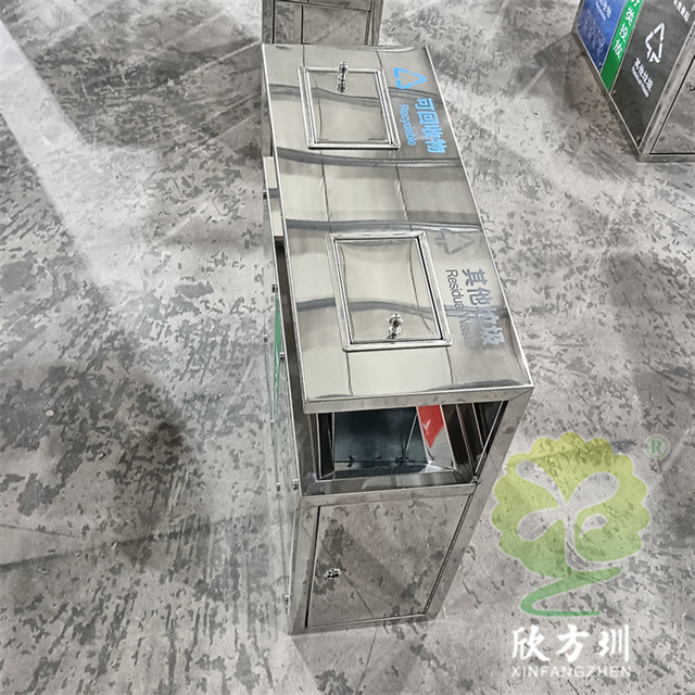 戶外城市街道鏡面不銹鋼分類垃圾桶采用了201不銹鋼板1.0毫米厚制作,也可以使用304不銹鋼板,正面亞克力板制作,不銹鋼表面鏡面處理,側(cè)面可以使用三角鑰匙開門取出內(nèi)筒,底部上方帶兩個(gè)把手打開兩個(gè)煙灰盅方便滅煙,亞克力和上方絲網(wǎng)印刷國標(biāo)分類標(biāo)識(shí),支持定制電鍍或者噴粉工藝處理。