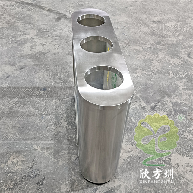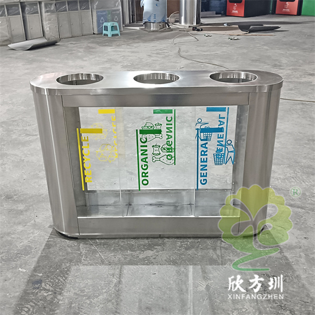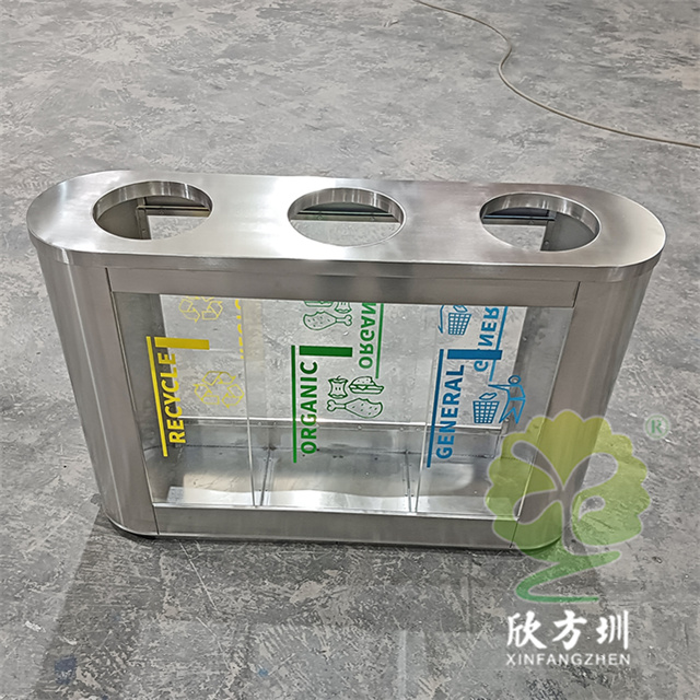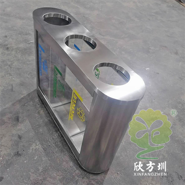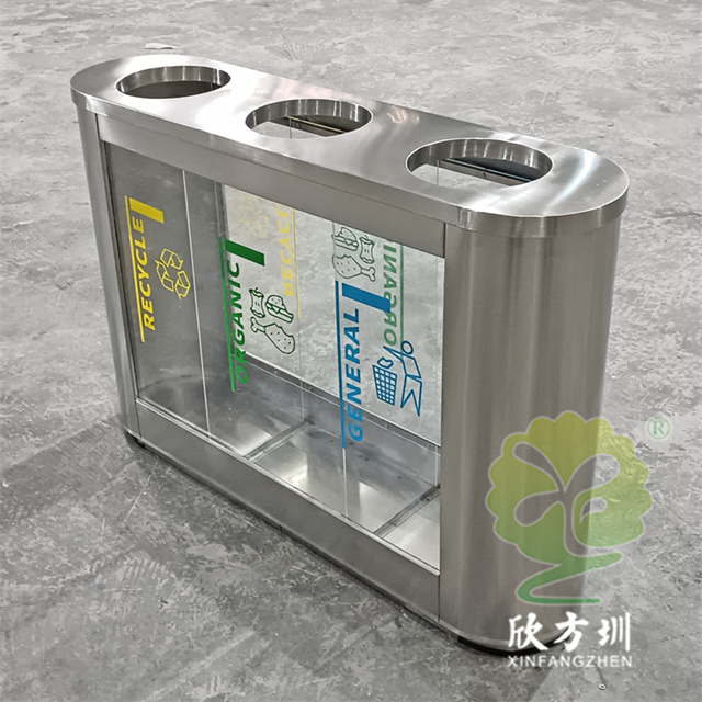 外貿室內環衛透明三分類不銹鋼垃圾桶可以采用201或者304不銹鋼板制作,橢圓形直投口三分類設計,透明部位可以采用亞克力板或者鋼化玻璃制作,投口帶不銹鋼鋼管壓垃圾袋,透明板可以絲網印刷中英文分類標識,支持定制兩分類四分類顏色尺寸或帶漏水槽,無內筒套透明塑料垃圾袋,便于環衛工人進行垃圾清倒,適合擺放場景:室內機場候機廳、高鐵站候車廳、購物商場、地鐵站等等。