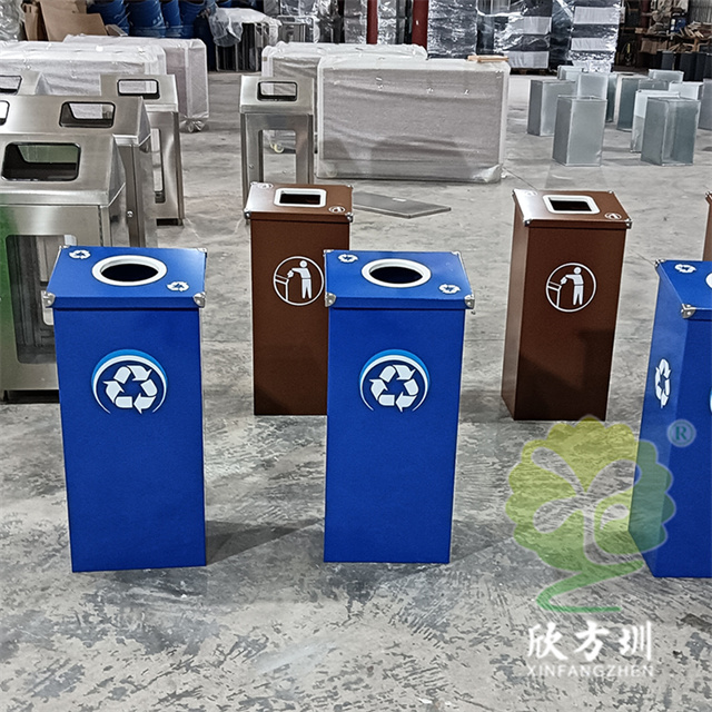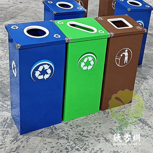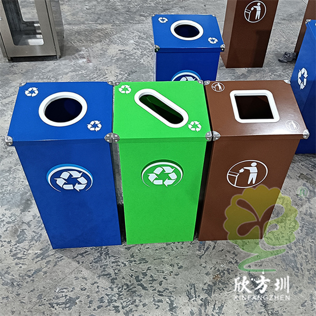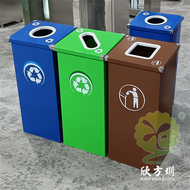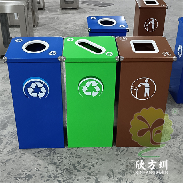 廣東烤漆三色不銹鋼分類垃圾桶投放點可以采用鍍鋅板、201/304不銹鋼制造,方形組合式立式直投口設計,噴粉烤漆綠色、藍色和咖啡色,投口圓形、橢圓形、方形開口,蓋子四角帶鉚釘裝飾,可以做固定支架,桶身正面和投口邊可以定制油墨絲網印刷中英文標識和人頭標。