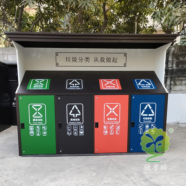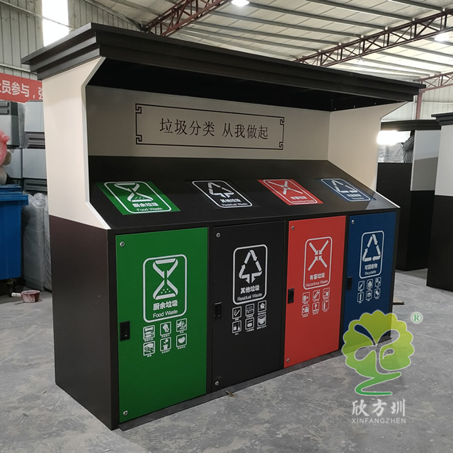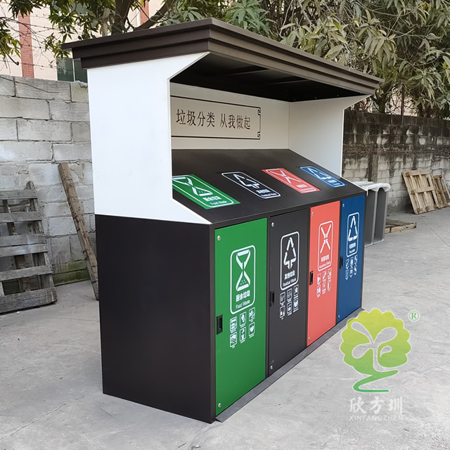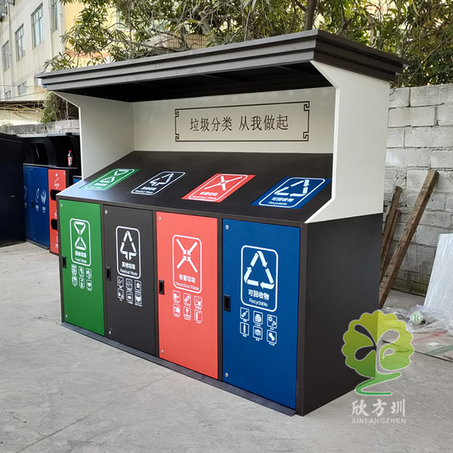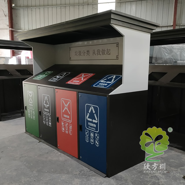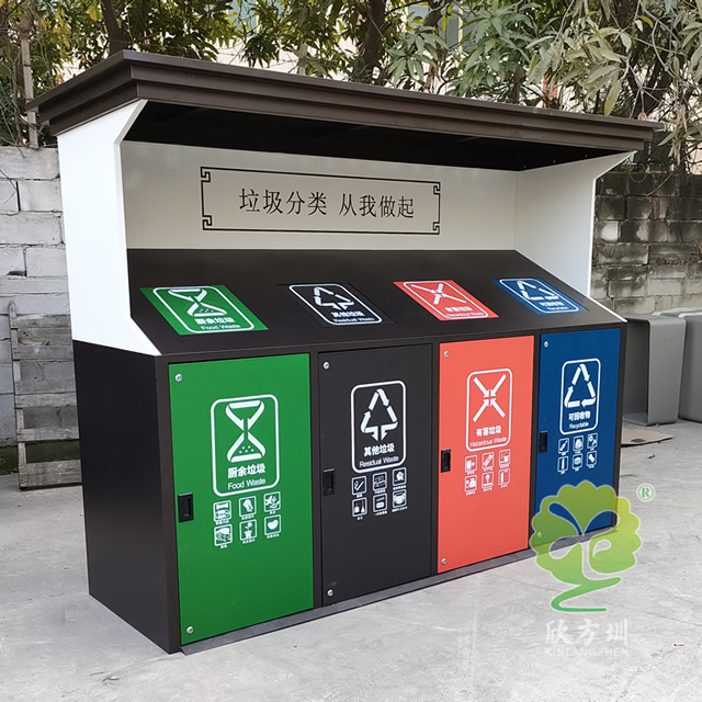 城市道路小區(qū)鍍鋅板四分類垃圾亭采用了鍍鋅板制作而成,四分類屋形設計,桶身采用了噴塑黑白配色,桶蓋和門板四色噴塑分別廚余垃圾綠色噴塑、其他垃圾黑色噴塑、有害垃圾紅色噴塑、可回收物藍色噴塑,桶蓋和門板油墨絲網(wǎng)印刷了最新的國標分類標識,正面亭子中心印刷了垃圾分類從我做起。