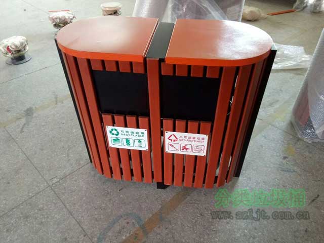 戶外精品鋼木分類垃圾桶長260mm,寬260mm,高900mm,桶身采用優質進口防腐木、進口山樟木或水曲柳制作,可抑制生物、微生物的寄生、繁殖與侵蝕,延長木材在戶外環境中的使用壽命。表面經過除蟲,防蟻,防腐,烘干等專業處理后加工成型,經久耐用,防腐美觀。桶蓋/內膽采用FRP玻璃鋼材料制造,具有防腐、防生銹、易清潔等特點。底座采用玻璃鋼纖維制作,從根本上解決了防腐、防盜、生銹的問題,產品在戶外的使用壽命大大增強。此款垃圾桶無論是從外觀,性能還是環保方面來講都十分優越,尤其適合擺放在花園,公園,小區,學校,街道,游樂園等場所,備受客戶青睞。